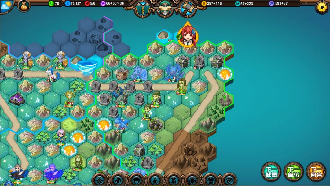 🍏右侧探查到边界,看地形绿色仅剩最后一城了,有了逆转战甲的绿龙猛地一批,只是需要每回合花二十点魔法给它补满血,绿色快寄了。