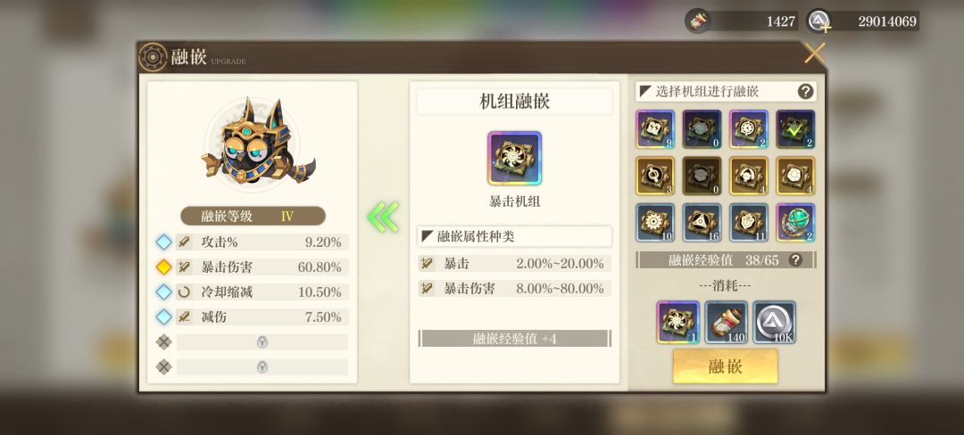 所以我们要关注规则中的这条能限定住词条的描述——“相同词条只会出现一次”。也就是说你不可能刷出两个爆伤词条,同时如果你已经有爆伤和暴击词条,那么再次用爆伤机组融嵌,它就不会再侵占别的词条——因为已经有暴击和爆伤,这两个都不会再出现第二个。这样就可以实现限定住刷新的词条,然后一直消耗机组刷这两个词条就行了。