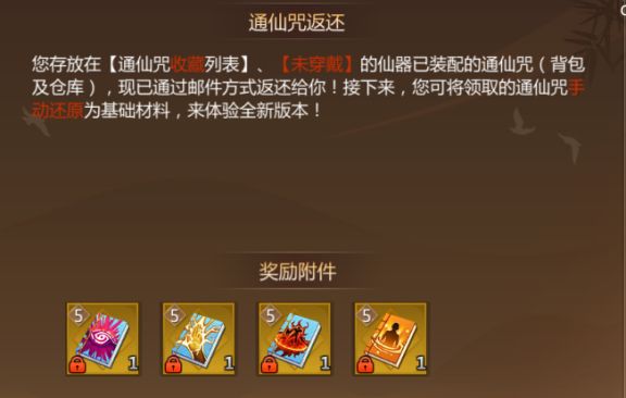 ②【收藏列表】及【未穿戴的仙器上已装配的】通仙咒以邮件方式返还,蜀友可手动无损分解为绑定基础材料和绑银。