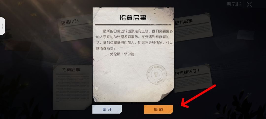 2.在西部哨所和红林哨所里均有一块公告板!我们查看公告板会发现一些奇怪的求助信息,我们可以点击查看选择离开或者揭取!奖励一百声望点和两千渡鸦银币,点击揭取之后!
