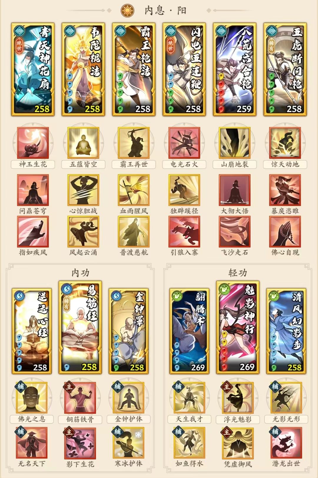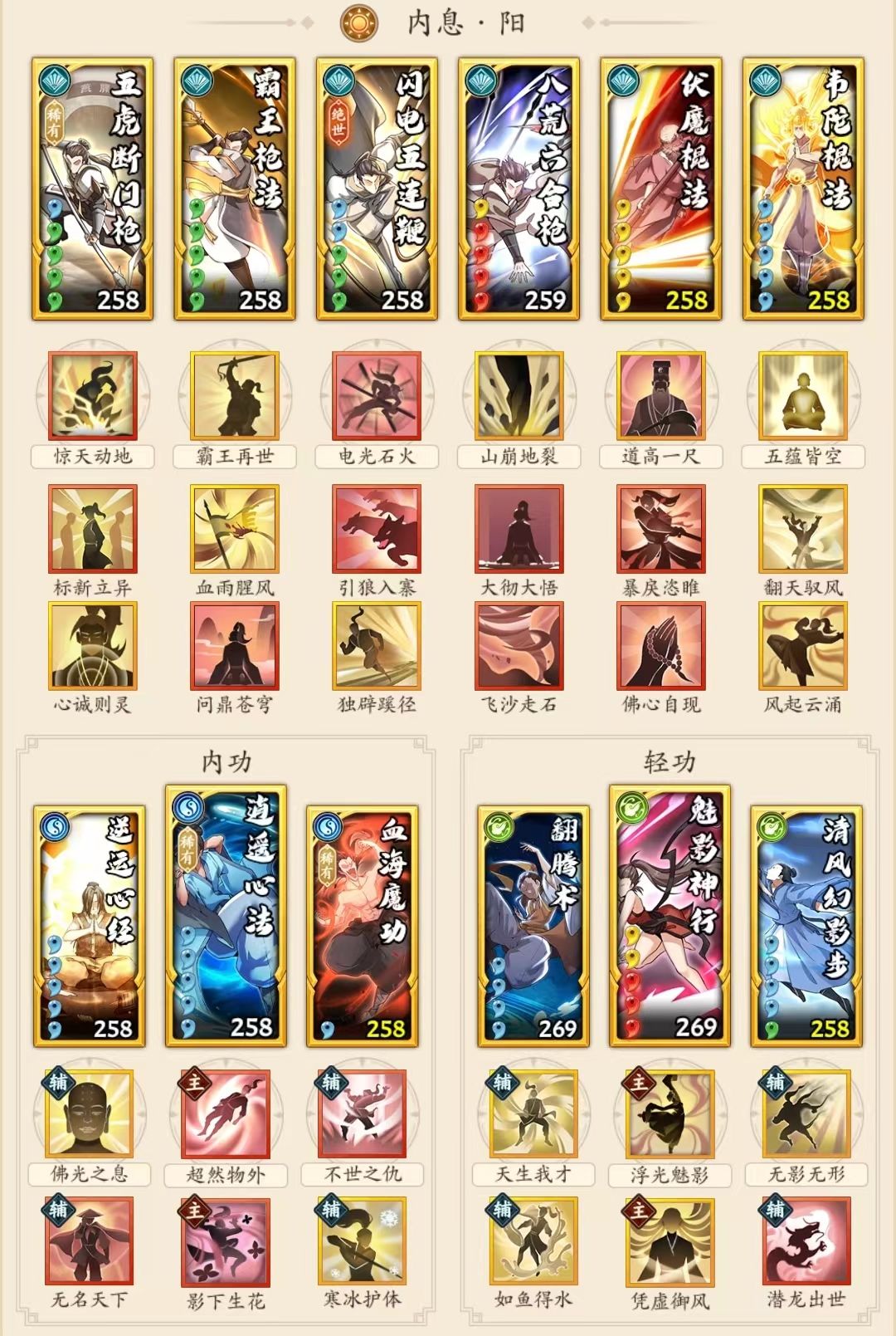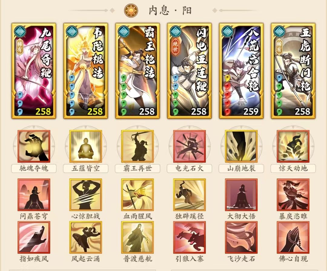 2、霸王枪法:小加强。上阵奇门6还是好凑的,比和金身不灭绑定更好。而且佛心和如鱼的调整使得阳奇不再需要引入剑系武学,更好凑6个奇门阵容,但也意味着可能要舍弃气海,减少控制。