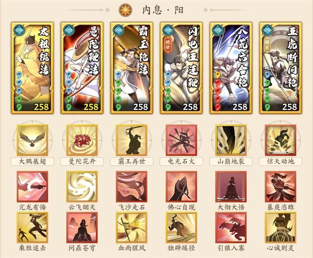 现版本,阳枪的培养仍可参考笔者早期写的这篇中的“三、属性培养”,仍然是聚气>四系,心愿方面优先八荒六合枪,其次霸王枪法和伏魔棍法(如果不上伏魔就心愿其它的)。