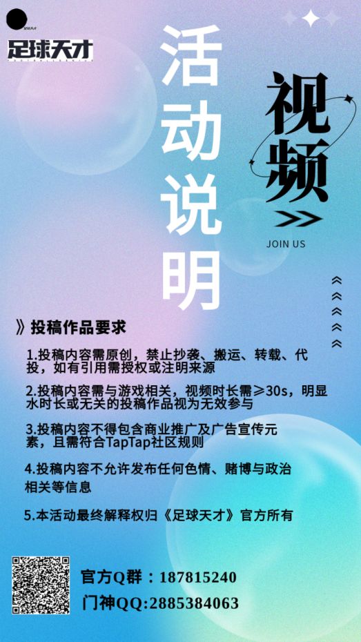 海选时间段内经理们可以自行在taptap足球天才论坛中发布视频,发布后需将视频帖子链接复制到本帖下方进行评论并附上自己的游戏ID哦~