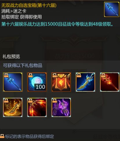 征战令等级达到48级且战力达到15000或官渡等级达到震古烁今五阶则可分别获得无双战力宝箱(第十六届)和官渡战力宝箱(第十六届)。