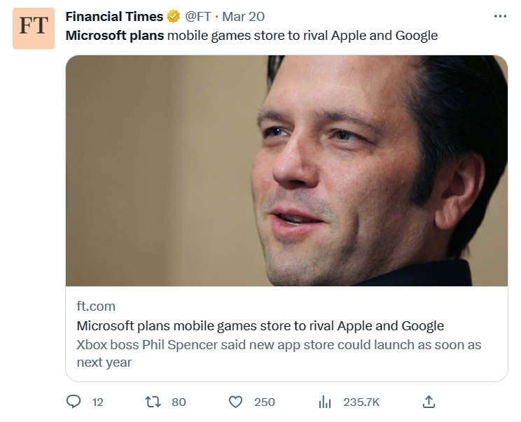 据《金融时报》报道,微软想要进军手游行业,推出类似苹果、谷歌那样的游戏商店。假如微软能成功收购动视暴雪,那么他们最快将在2024年于iPhone和Android上推出一个新的游戏应用商店。