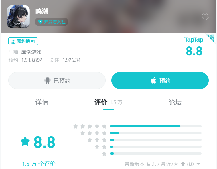目前鸣潮在taptap预约近两百万,经过上一次内测评分保持在了8.8分,游戏各方面素质都很高,并且有腾讯的入资不会有资金压力,游戏未来还是值得期待的。