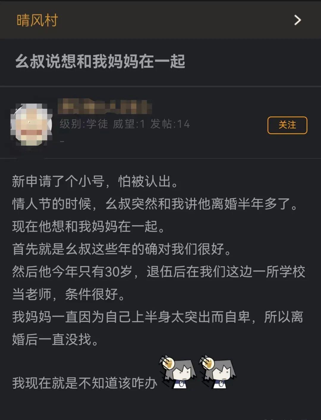 几天前有一条标题为“幺叔说想和我妈妈在一起”的帖子出现在了晴风村,点进去一看又是乱伦、绿帽、情色三要素齐全,大概故事就是楼主妈妈与爸爸离婚多年,而楼主幺爸(爸爸的弟弟)突然告诉楼主他想与楼主母亲在一起。