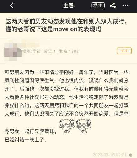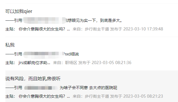 点进去果然不出你所料,正是一篇火热滚烫的“抓奸”贴。楼主气急败坏地描述着自己怀疑的理由:“(对方)微信联系不上,电话关机,最后的定位是晚上八点半的一个公寓,****!”