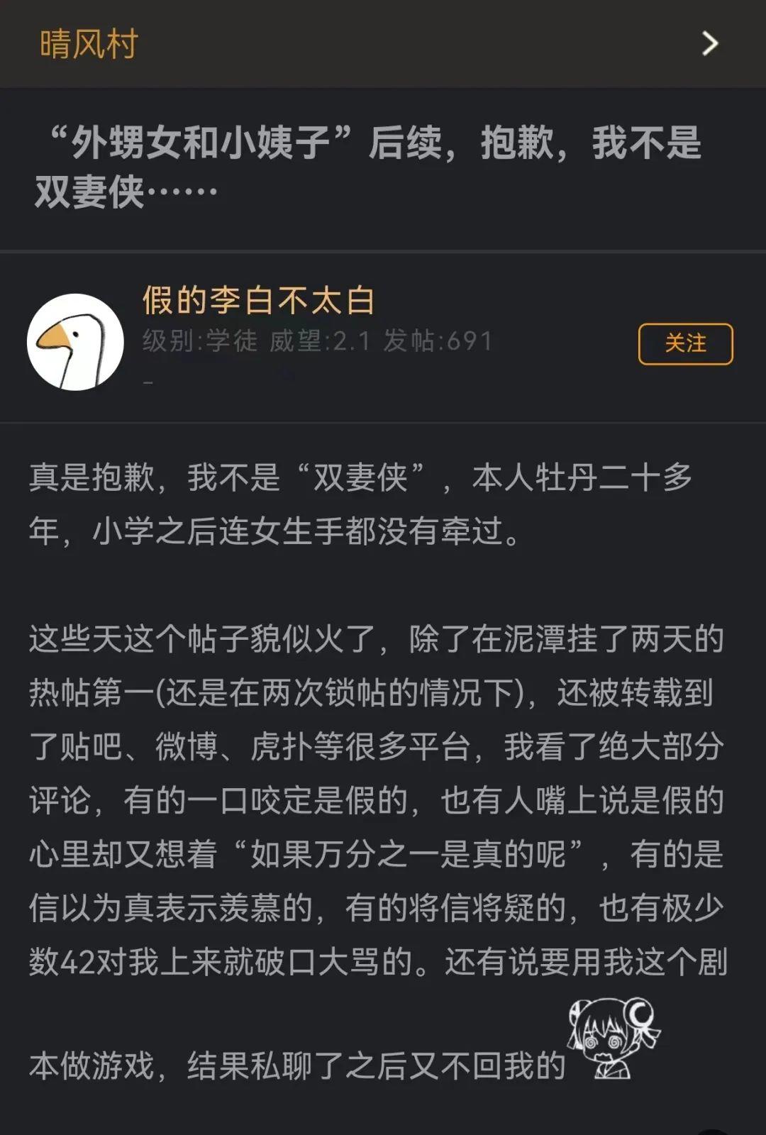 翻看楼主的过往发帖纪录,不难看出这位名为“李白不太白”的RPG写手本职也确实是一个情感向网文作者,所以写小姨子故事最初的目的就是给自己的作品拉热度,这一点他也在“认罪贴1.0”中承认了。