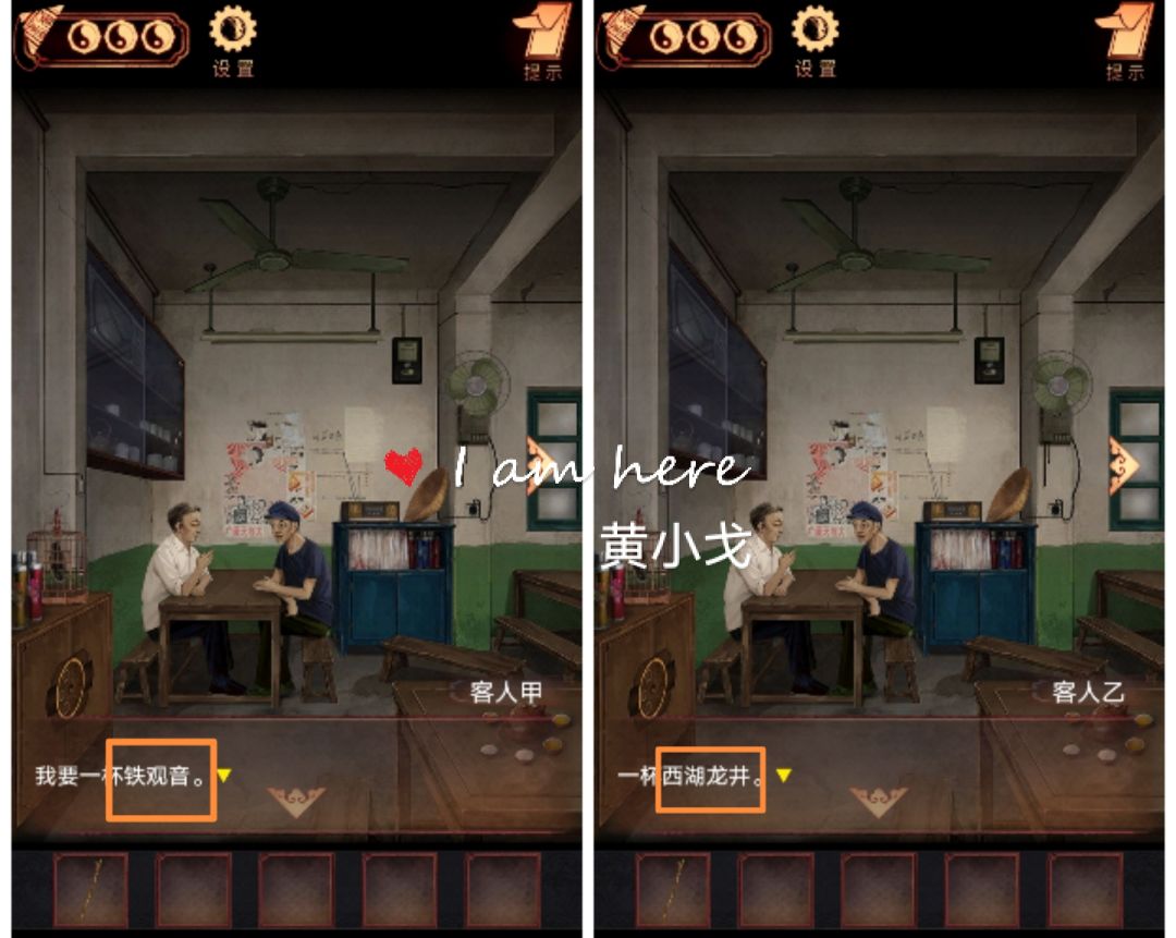 2.(茶馆-场景1)点击右边的桌子,查看茶杯中茶的颜色(上:白、右上:黄、右下:白、下:黄、左下:黄、左上:白)