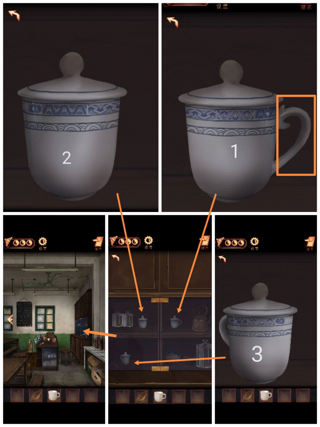 9.点击查看玻璃柜中各茶杯上的花纹,根据茶杯把手上的箭头,确定茶杯上花纹的顺序(逆时针)