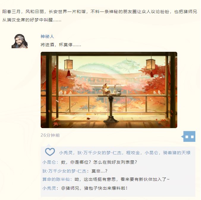 猪师兄从好梦中惊醒,就看到御灵院炸开了锅,大家都在讨论这个莫名出现在好友圈的神秘人是何来历,也有不少御灵师围着猪师兄想听爆料。