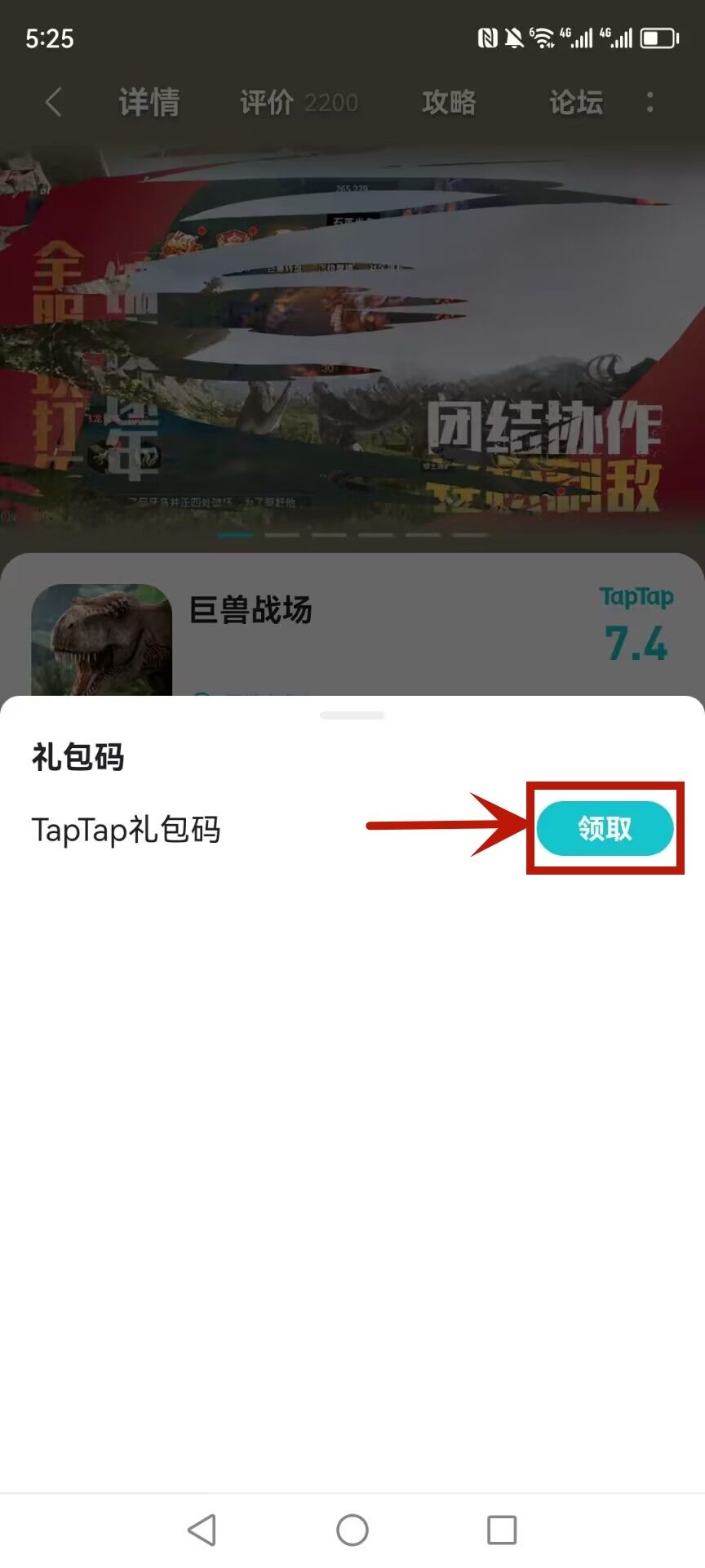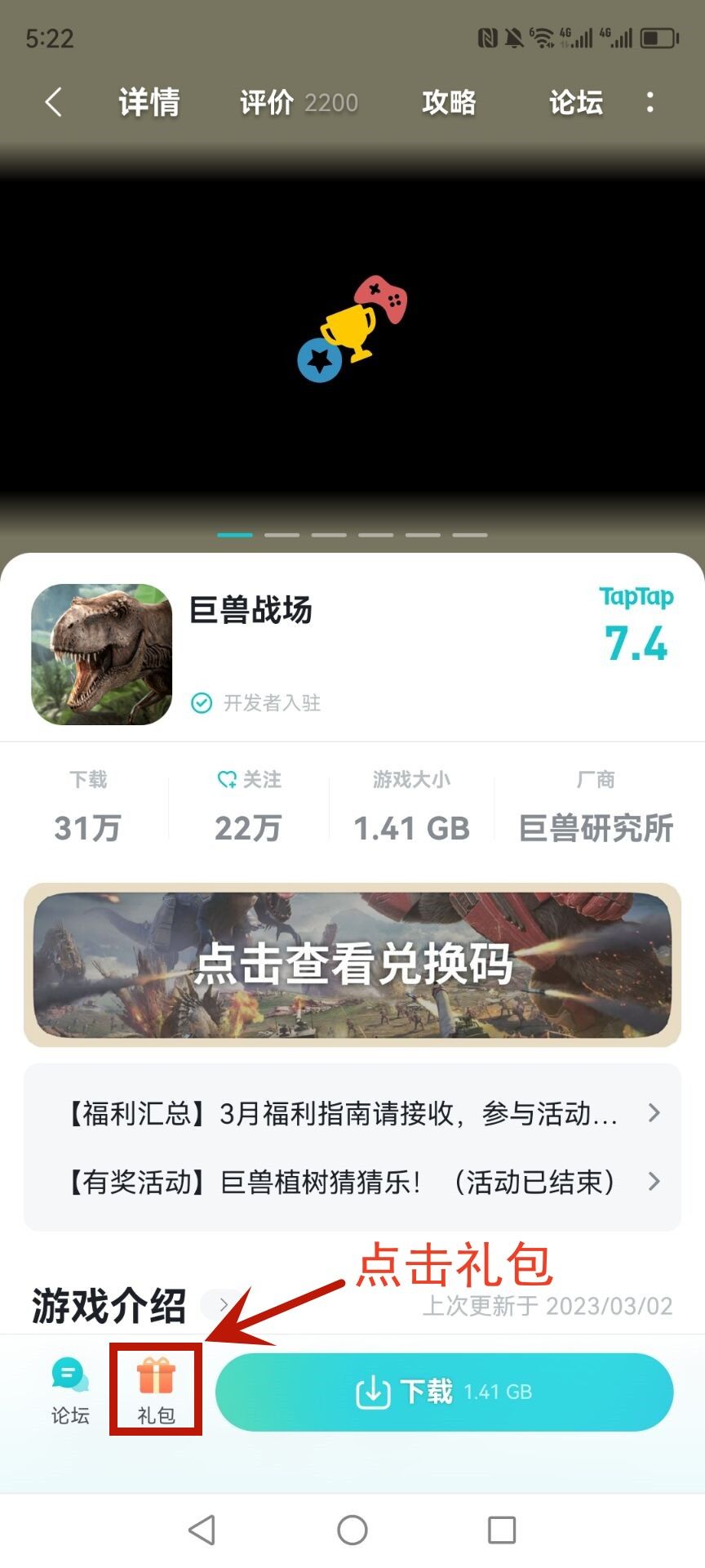 ✔安卓端进入TapTap搜索巨兽战场-进入主页面-左下角礼包-TapTap社区礼包码(即3月社区礼包)