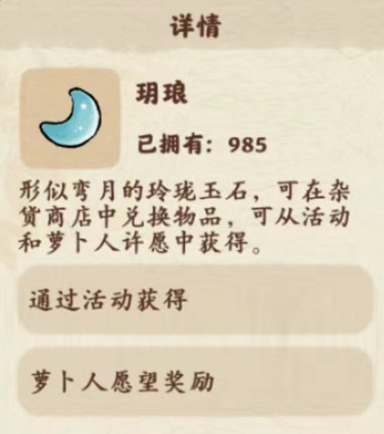 A7:是玥琅。在游戏下方目录栏“游乐-杂货-材料”中用来兑换卷轴、建筑材料、加速符、食材、鱼饵等,以及在“材料”下面的“装饰”中兑换乙丙级装扮。
