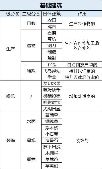 A12:在游戏下方目录栏最右边的“营造”中,可以看到建筑被分为四大类——生产、娱乐、装饰、收纳。下面是我整理的各类建筑一览表,以便各位萌新直观理解。
