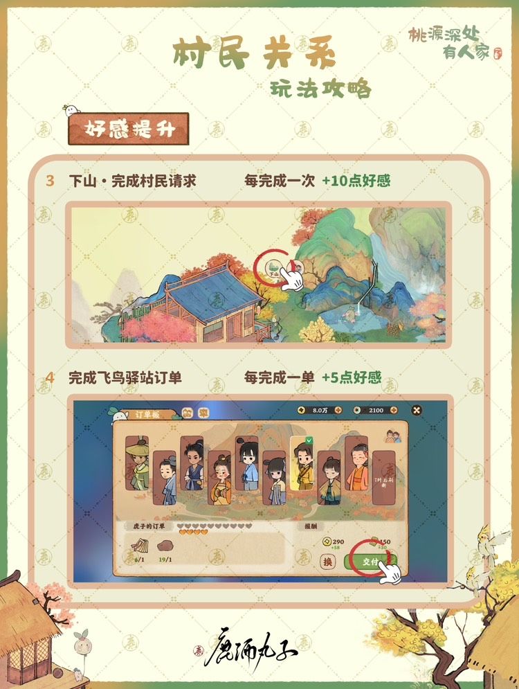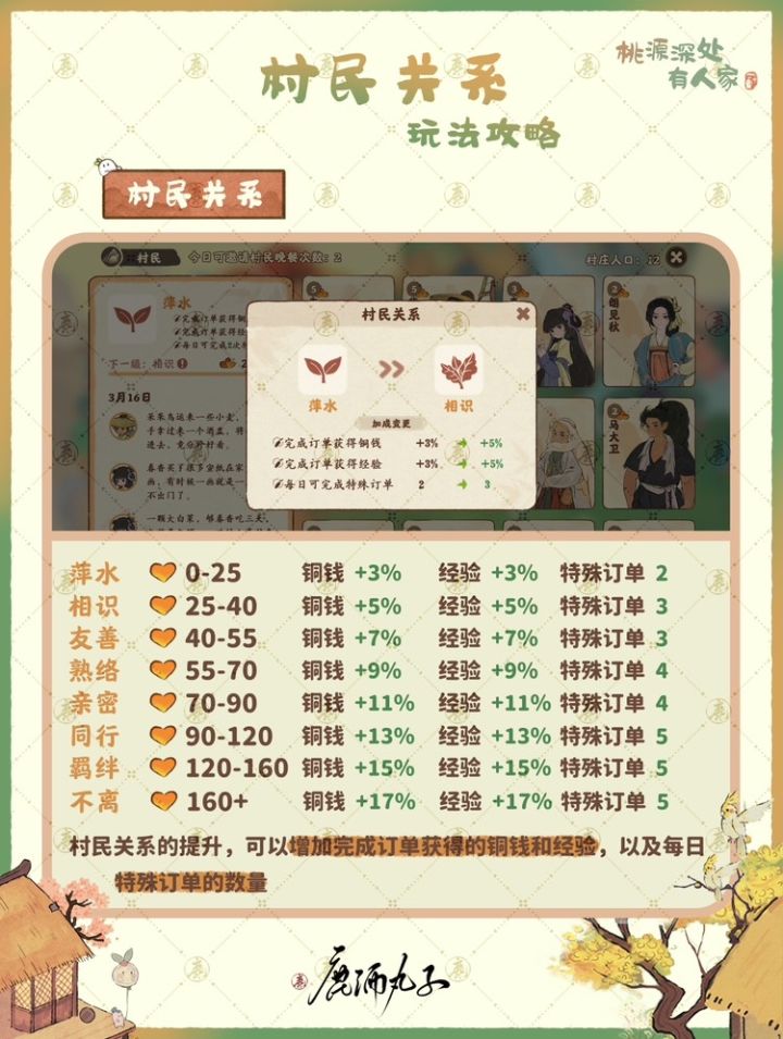 🌸村名关系提升,可以增加完成订单获得的铜钱和经验,以及每日特殊订单的数量