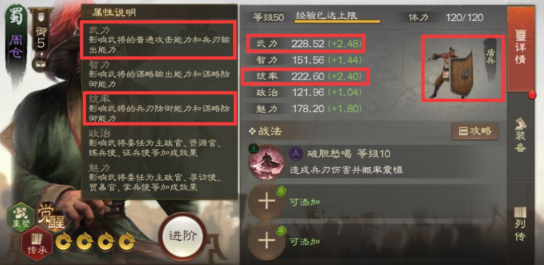 面板方面拥有不错的武力值和统帅值,这两个属性分别影响的是输出能力和承伤能力,都是很关键的属性。