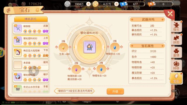 然后就是宝石升级,每个装备同时镶嵌四个宝石可以触发宝石共鸣然后提升不少的战斗力,当四个宝石全部提升至同一等级宝石共鸣也会随之提升属性,以此类推四个宝石相同等级越高共鸣加的属性就越高,宝石每提升一级都会提升不少的战力,宝石最高等级是九级宝石。