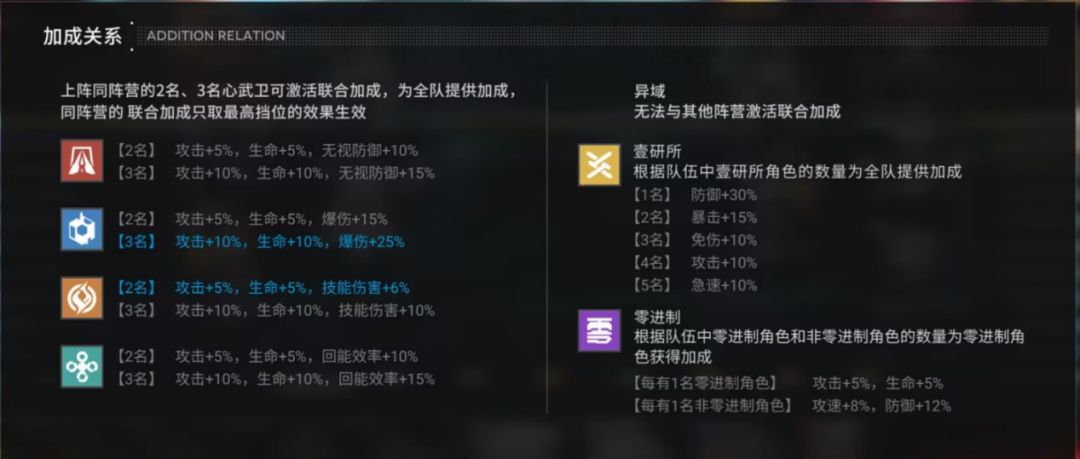 而零进制共有两名角色,其阵营加成是为其自身提供加成。贪狼可召唤替身提升自己的伤害,而破军身为射手搭配提升攻速的效果,可以持续在队伍中进行输出,常用于队伍的输出核心或补充。