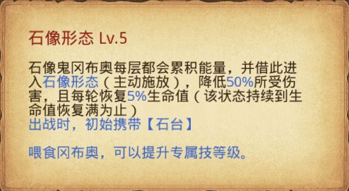 石像鬼冈布奥的天赋技能:石像鬼光环 | LV2所有冈布奥升级恶魔系称号时,降低15点探索点消耗