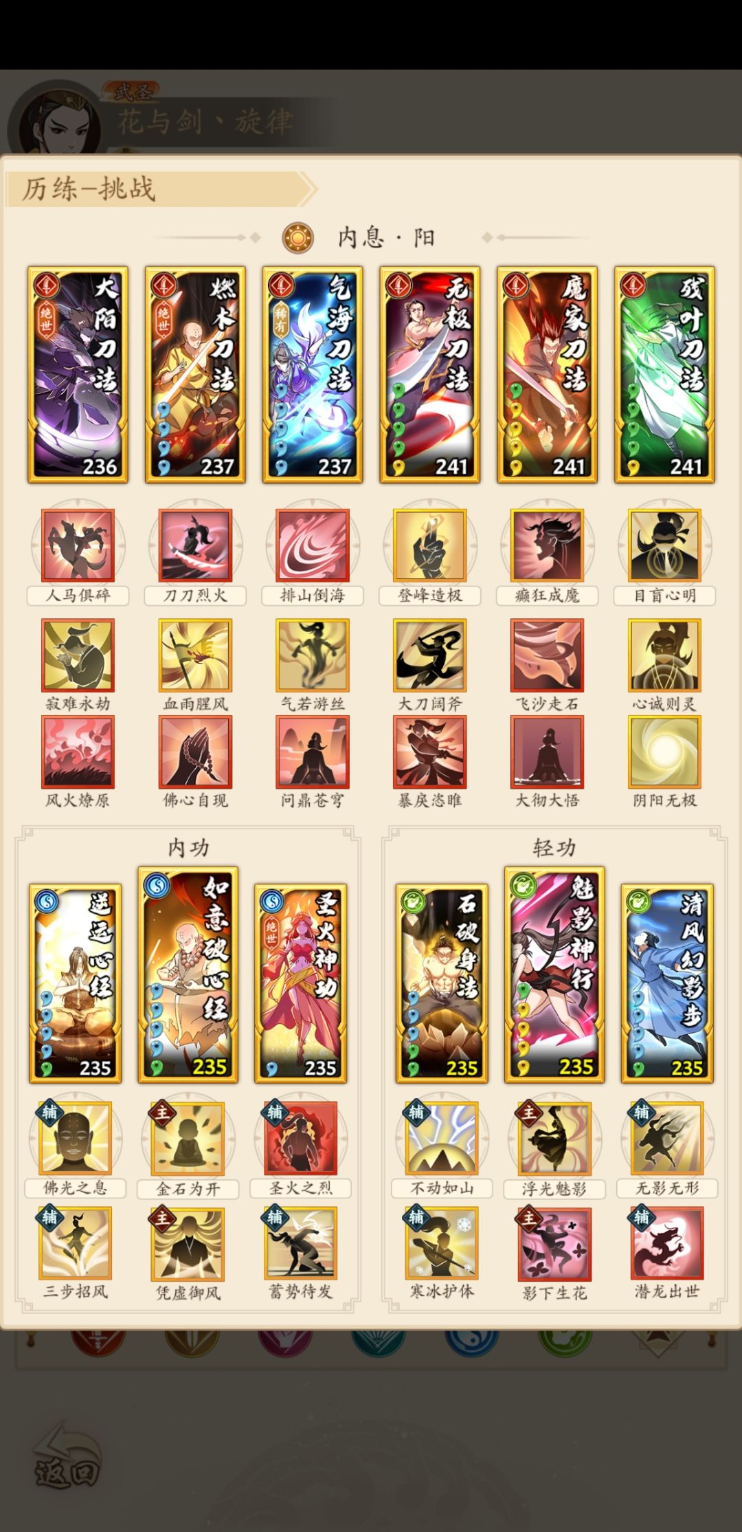 a、一号位大陌刀法(没有大陌可以带太祖棍法-稳定1后手或霹雳刀法70%后手+2级心惊):本人一直是后手的爱好者,放后手的好处不少,其中一个最重要的原因就是不怕心惊,第二个好处是就算没触发,配合石破身法还能加伤害。第三是在气海刀法之前挂上后手可以减伤。放第一的原因是因为目前调和剑出手一般在1号位或者6号位,阳拳一指禅一般1号位或者3号位,阳奇门1号位或者2号位,基本上无论你先手还是后手,放一号位均有机会触发后手;招式我选用的是寂难永劫(2回合散功,变向降低对方聚气,针对大部分都带的清风幻影步),风火燎原(加灼烧,主要是伤害,配合圣火拼招加暴击)