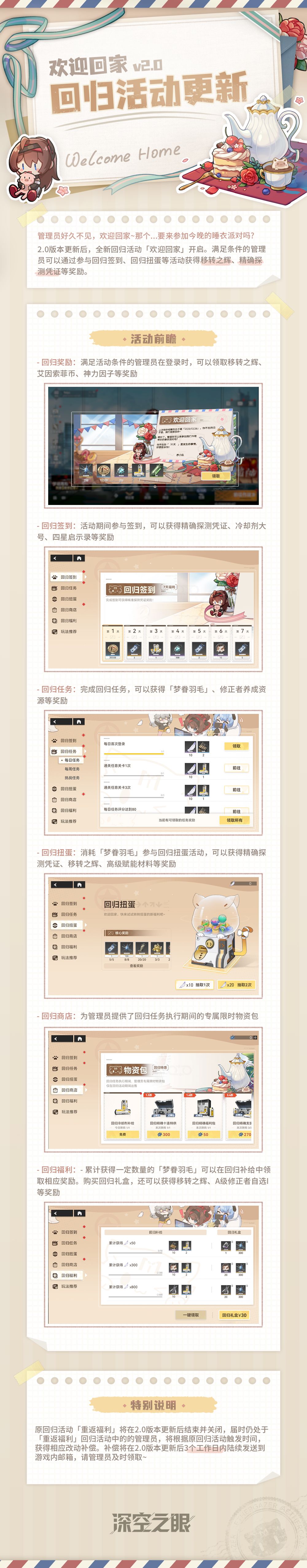 2.0版本更新后,将开启全新回归活动「欢迎回家」!满足条件的管理员可以通过参与回归签到、回归扭蛋等活动获得移转之辉、精确探测凭证等奖励~