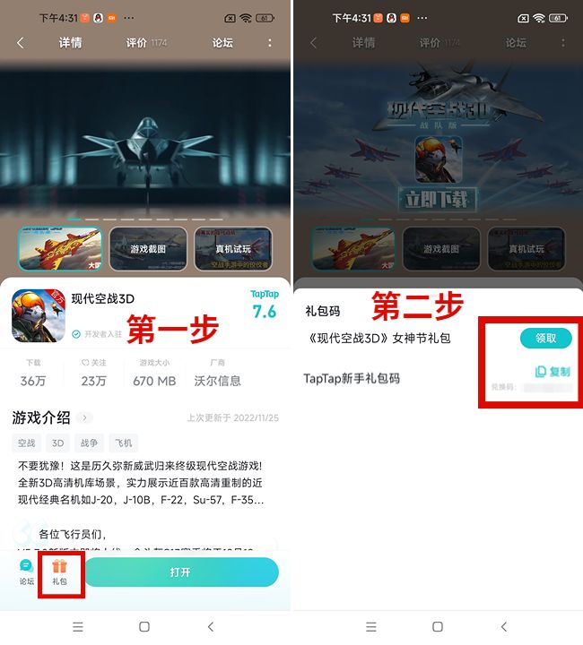 1. 关注TAPTAP(现代空战3D / 坦克争锋 / 空战争锋)官方账号在详情页领取女神节礼包兑换码