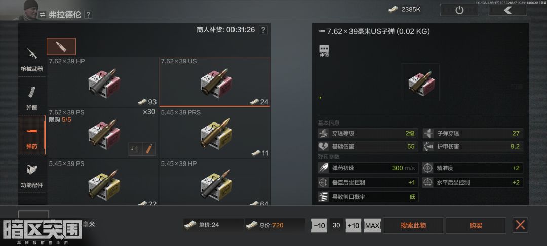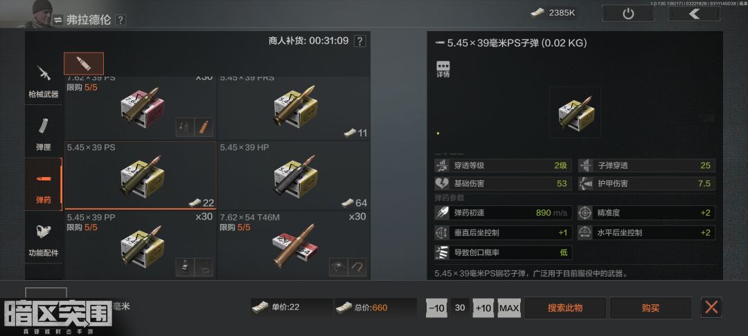 最后再来看T85的表现,同样的距离,但是除了测试打腿以为还测试了对三级甲的对抗能力,因为很特别的一点是,图里人机身上如果刷到这把枪,必定是30发标准大弹匣加上这个口径的AKBS弹,这个子弹数据上面也有发出来,这个是二级子弹,穿透性比pst弹差一点,但肉伤在同口径排第二,在近距离也能勉强击穿三级护甲,而打腿部的击杀能力并不比LRN这个纯0级的肉弹差,还是不错的,而且标准型号的操控难度明显更低,属于是非常值得拿上的武器。