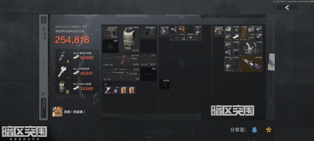 运气不错,开局不就就碰上一个玩家在找地方送货,这是一个四套,这把打的有点卑鄙,因为我发停止射击骗到他了,他一直很警觉,但是我最后还是抓住机会一梭子打腿带走,具体情况就和上文中靶场测试的一样,二十五万肥肥撤离。![[嗒啦啦4_不愧是你]](https://img.tapimg.com/market/images/a9080a7d42b1d9baf3fa892c54bf3381.gif)