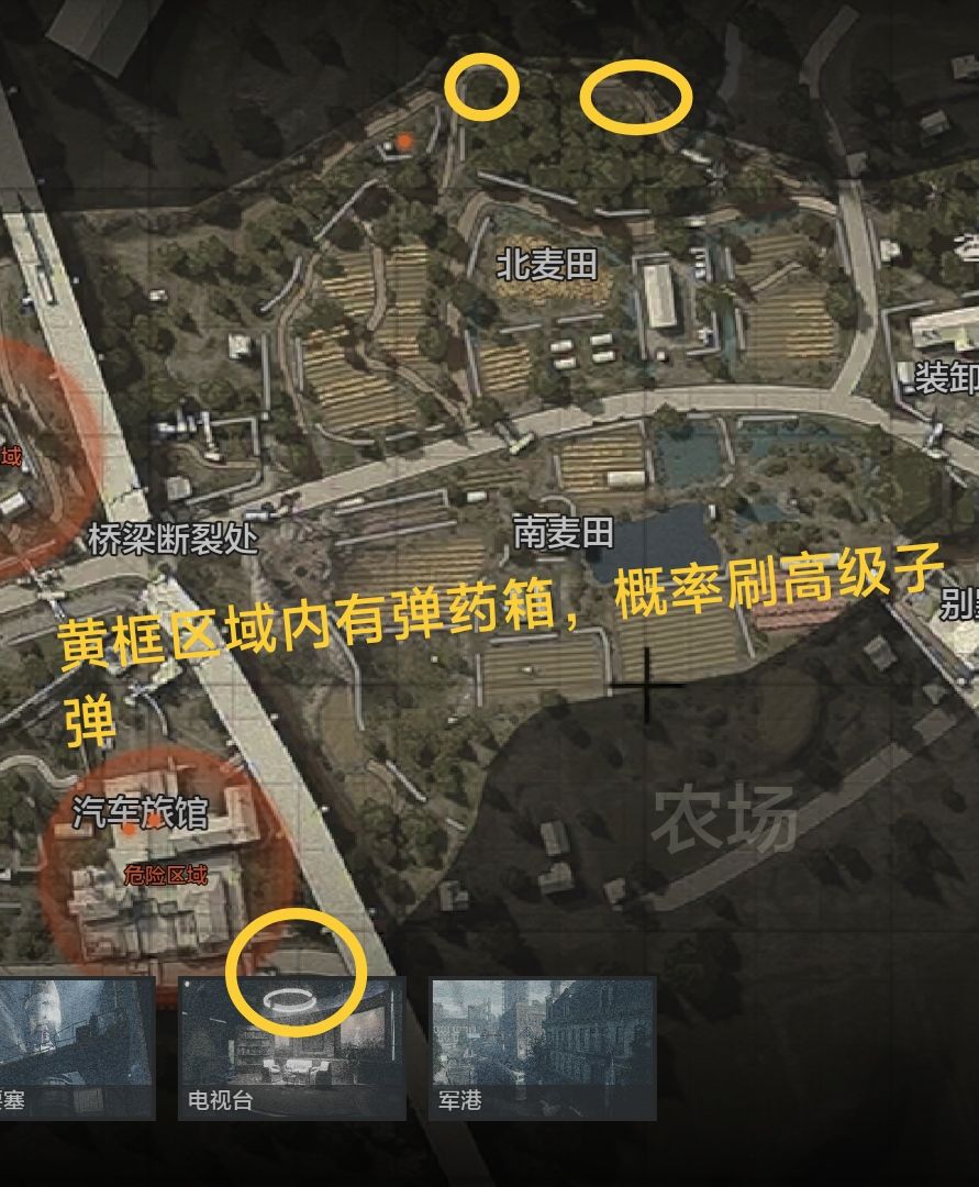 这个是大家熟悉的达姆弹,如果能在图里搜到这玩意,那更是让这把枪,以及所有同口径的武器如虎添翼了。弹药箱位置可以看这张图,同时,s2更新了农场谷物交易站二楼雨棚上的两个弹药箱,其中有一个是必刷9x19口径的子弹的,如果顺路,可以去碰碰运气。