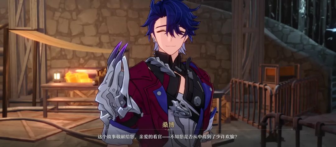 在雅利洛故事的最后,疑似假面愚者的桑博向着屏幕之外的我们谢幕——正如他歌颂的欢愉星神那样,他们不仅识破了宇宙的虚假,甚至更进一步地窥破了第四面墙,看到了屏幕之外的“我们”。不像是主线剧情大多数时候呈现的第三人称视角,这个镜头给的正对中央,仿佛他真的看得到我们一样。