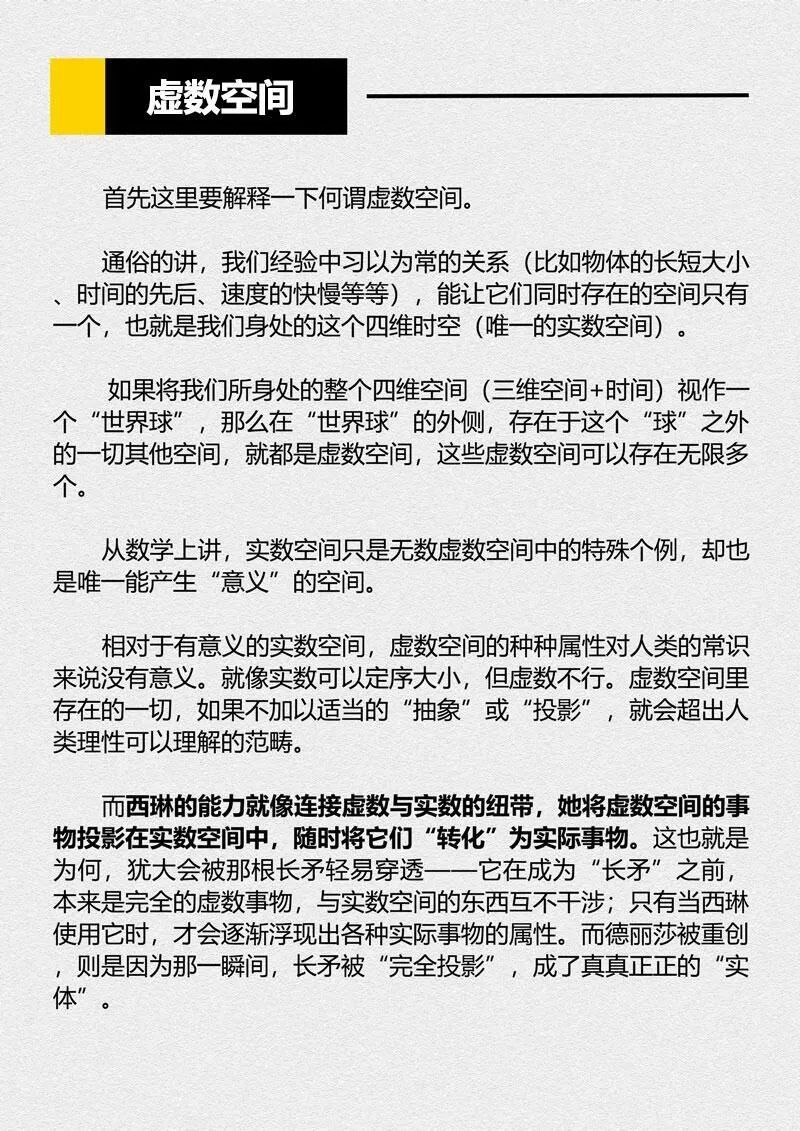 ——你以为我会这么说吗?鬼!要是崩坏的虚数有这么简单就好了。我们所知的物理根本不能解释崩坏无所不能的原理,与其说崩坏的“虚数”是数学或者物理的术语,倒不如说是个被哲学借走的语汇。在编剧给出的解释中,虚数一般指虚数空间。虚数空间无穷无尽,而我们身处的实数空间则是虚数空间的特例,虚数空间的事物本该只有经过投影才能进入实数空间。