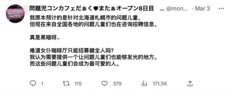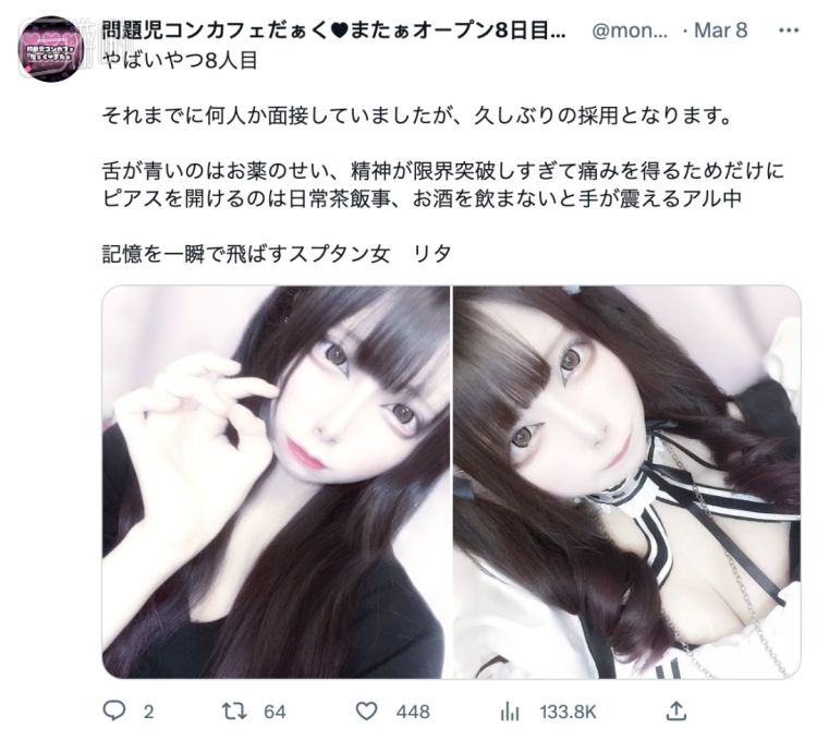 在今年二月,「问题儿童咖啡厅」就已经确认成立,并明确了自己的“病娇属性”。它于推特上成立了自己的官方号,小做宣传之后,就开始招募自家的女仆店员。