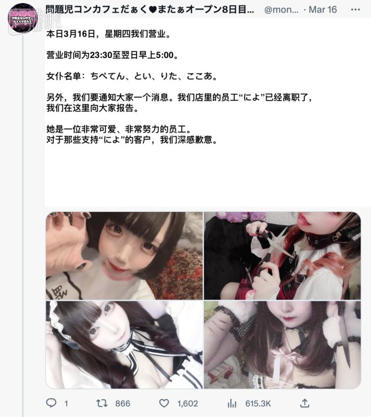 但「问题儿童咖啡厅」里的病娇显然是实打实的。在宣传期间,店主为了强调员工们身份的真实性,还会一并标示出她们的社交账号。