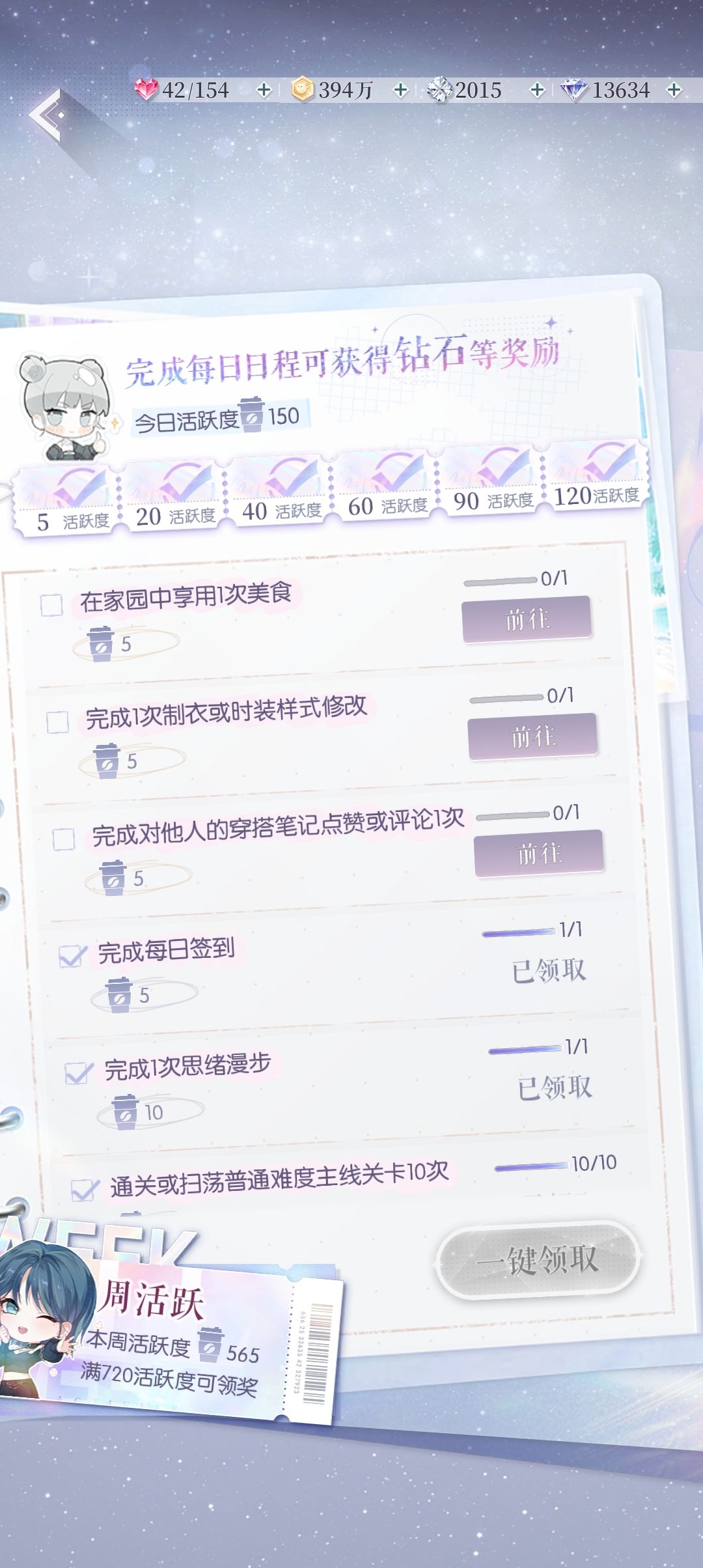 12.【主界面】→【日程】点击一键领取,领取奖励,完毕。