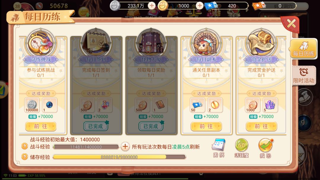每日副本分为普通副本和挑战副本,副本需要达到一定等级才可进入,相同副本挑战会比普通难打且进入等级提高,不过奖励也十分丰厚。玩家可在每日玩法中接取赏金护送任务,护送黑月公主到达终点即可,中途会出现两波怪物来袭,全部击杀即可。