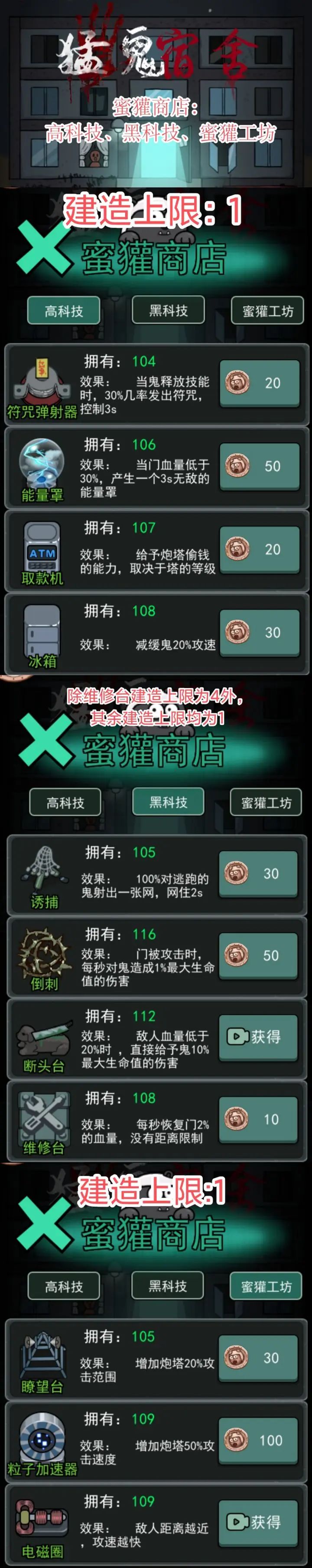 挑熟悉的宿舍(“凹”最合适)→床升到+2→门升到2级铁门→床升到+8→增加火炮(数量至少4个)→门升到5级铁门→床升到+16→炮升到2级→床升到+32→炮升到3级→增加游戏机(数量至少2个)→门升到3级钢门→床升到+64→炮升到4级→增加维修台(至少两个)→游戏机升到+2→增加铜矿(至少1个)→门升到5级钢门→床升到+128→增加符咒弹射器→增加冰箱→之后就主要攒钱升门升炮,有空格也可以增加其他高科技黑科技或蜜獾工坊中的材料(发育之后后期就可以随便增加材料杀猛鬼,前期这样也不是固定搭配,主要还是随机应变)