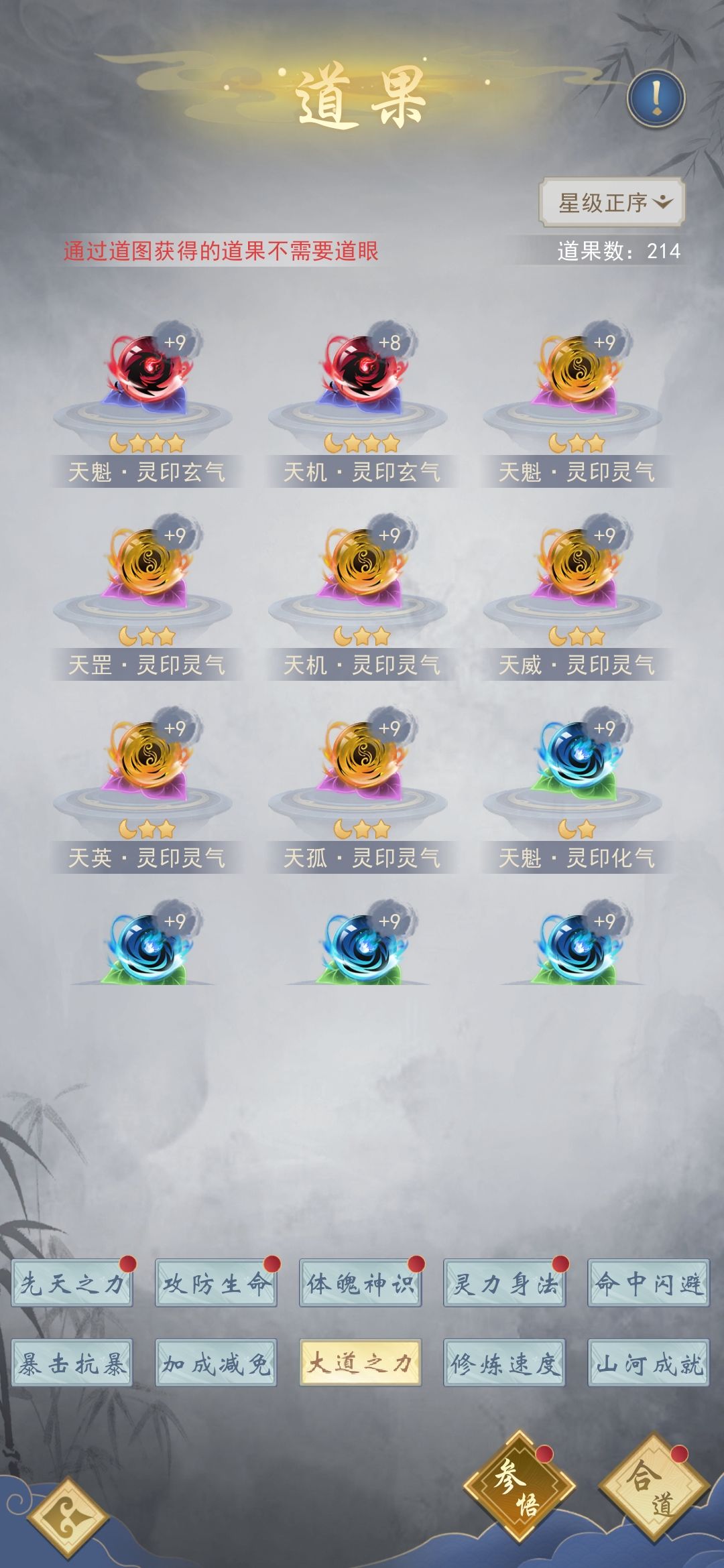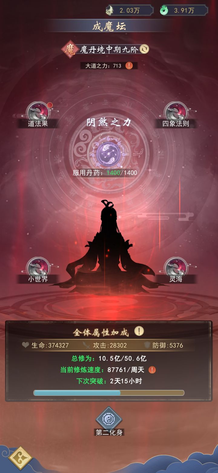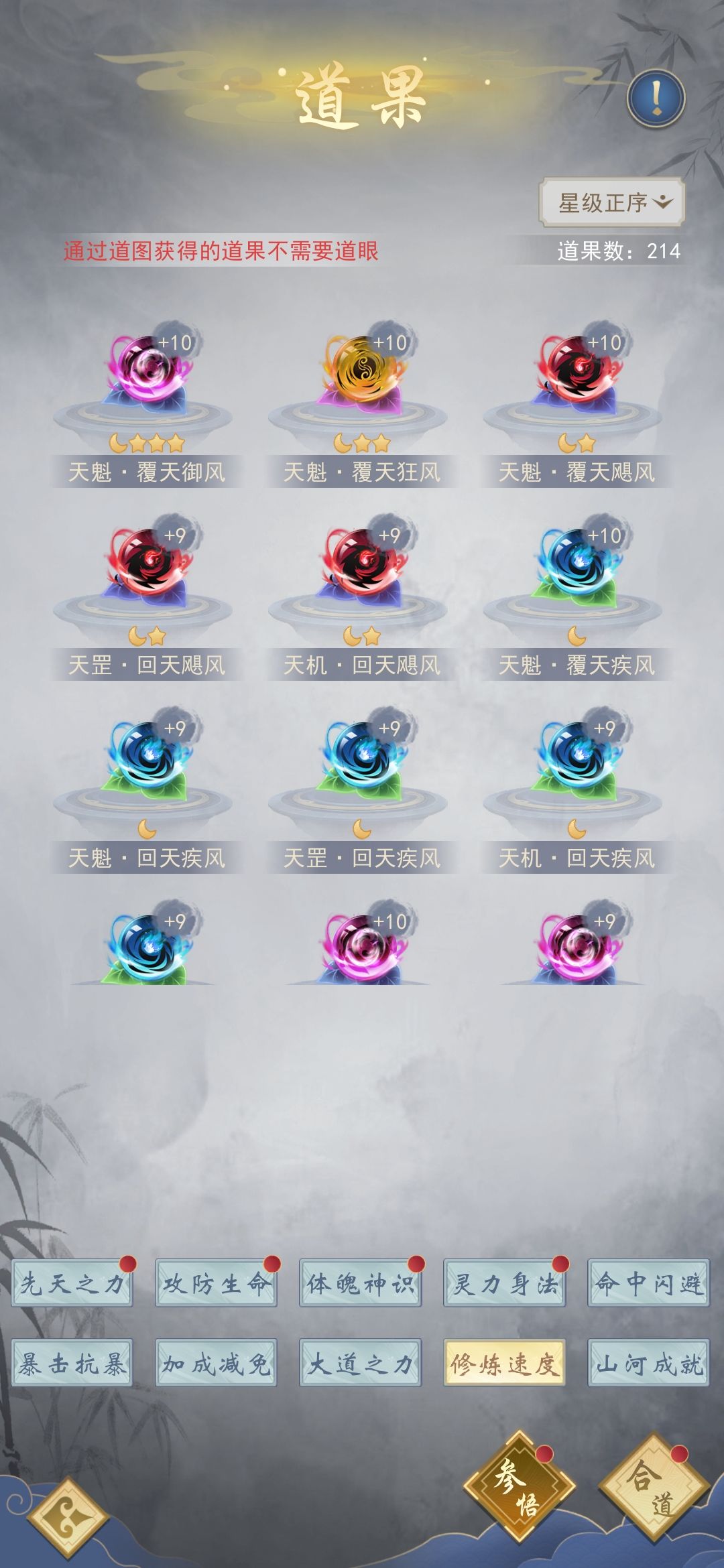 7.优先拉满修炼速度道果的等级,拉到上限之后再拉大道之力,然后准备下一个等级的修炼速度道果材料,直到拉满再选择拉属性道果,满级10级,魔丹后期就能拉满
