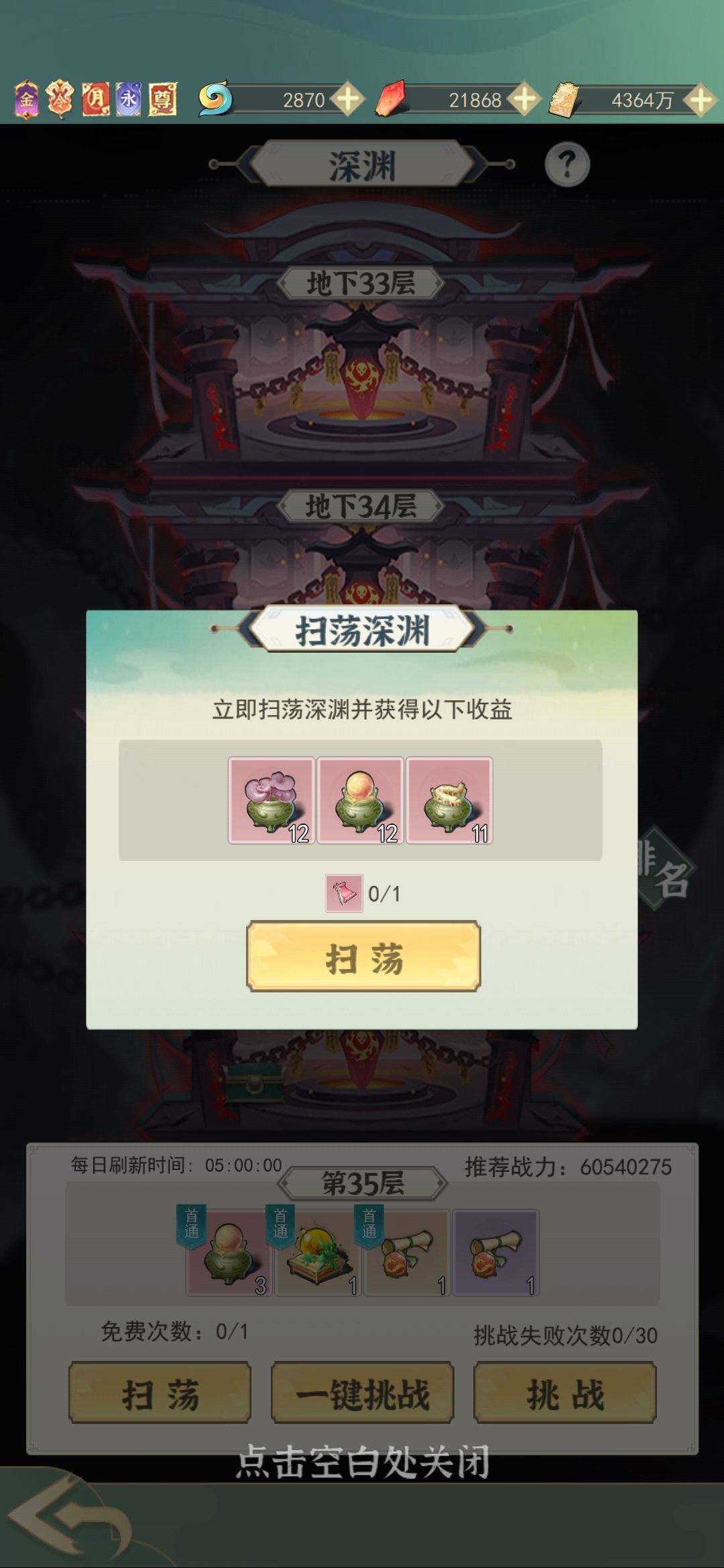 3、灵界开放深渊,可以获得各种超级丹药。每天打满并扫荡一次,当你要突破卡锻体或灵根时,优先用扫荡卷,再用钥匙。