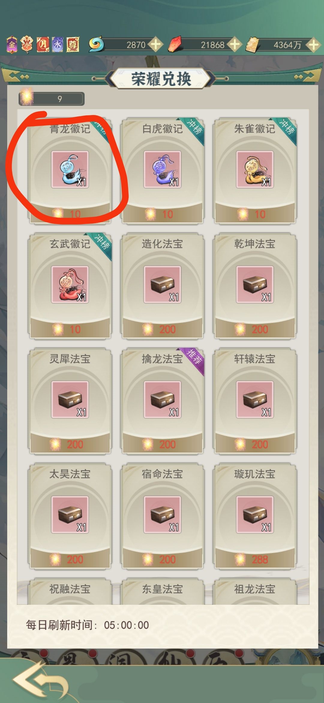 3.斗法荣耀点,都换青龙,因为今雪堂的等级决定了你修为的获取效率。