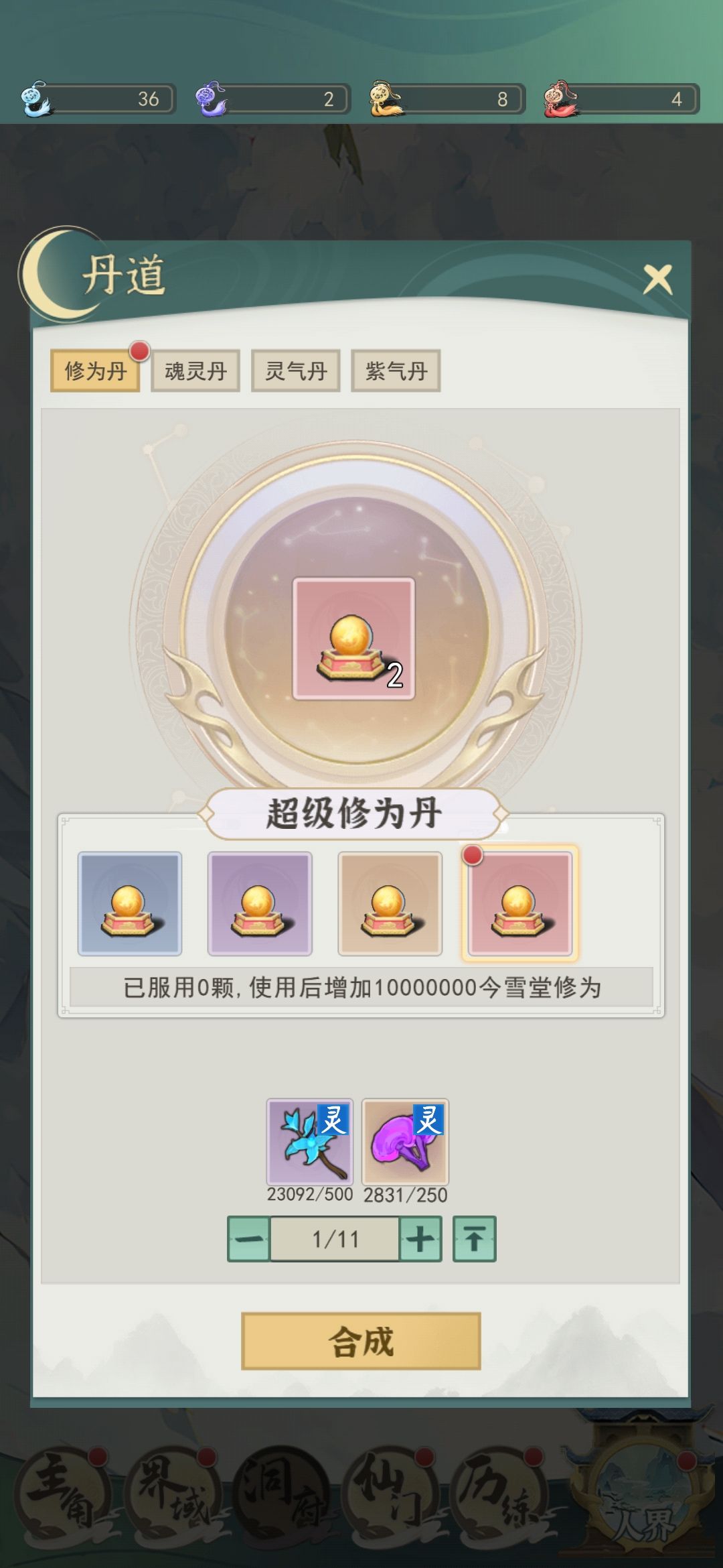 1.仙界可以合成超级丹与属性果,问鼎前少炼果子。保证每天炼满10个超级丹,多余的再炼果子。