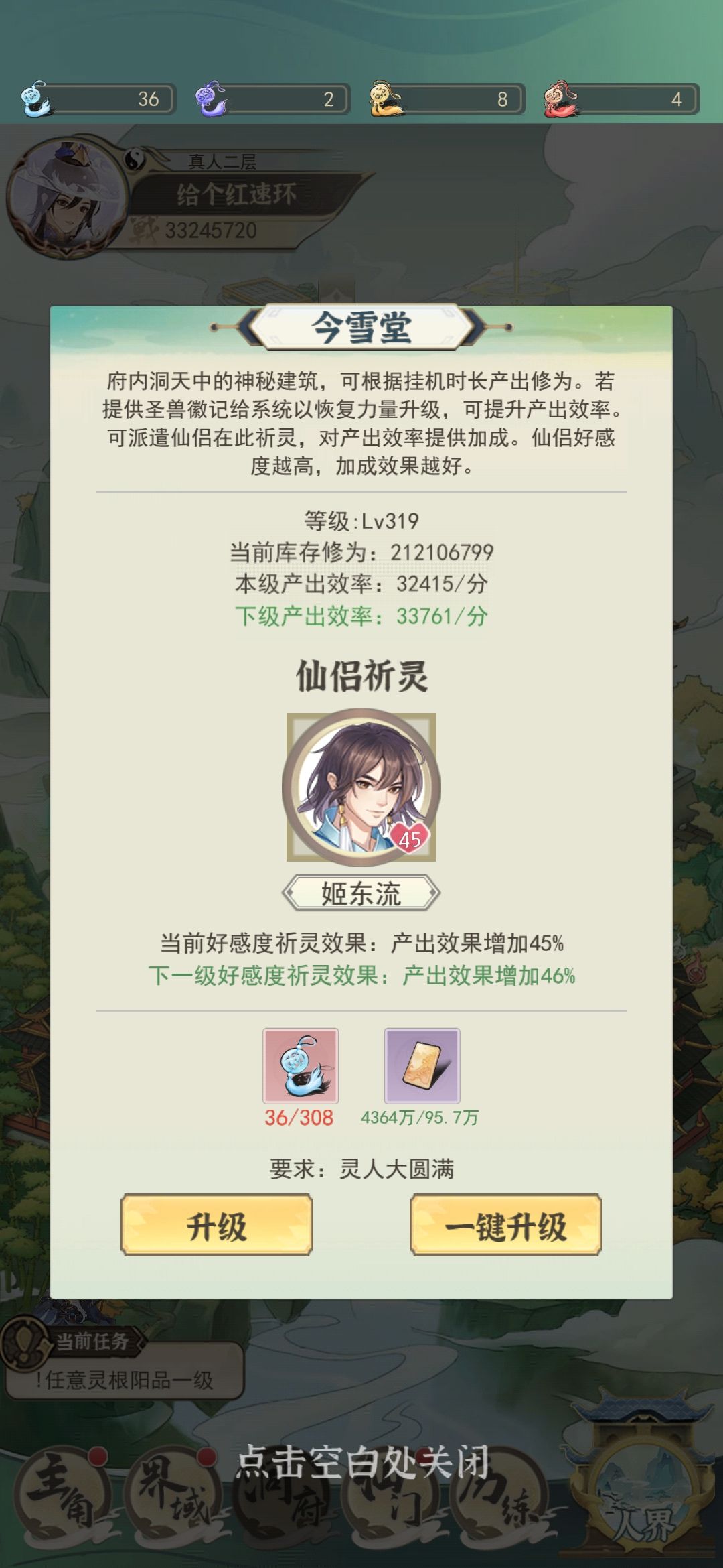 2.尽量升一个45级的仙友放在今雪堂,这样可以提升45%的修为获取率。