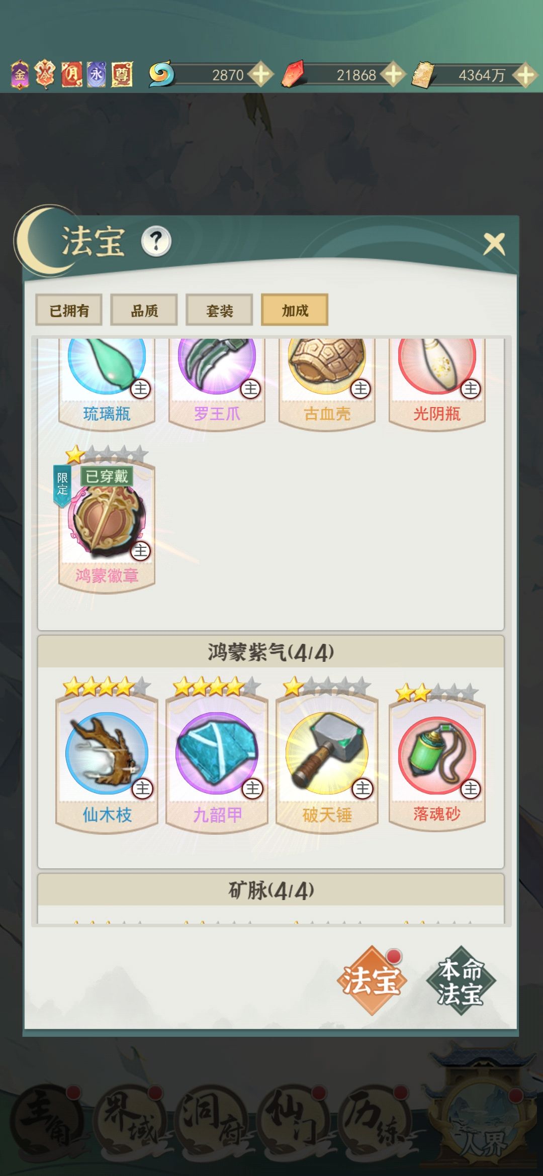 7.修为法宝能升满升满,并穿戴加成百分百最高的法宝,副升锻体,剩下看需求升。