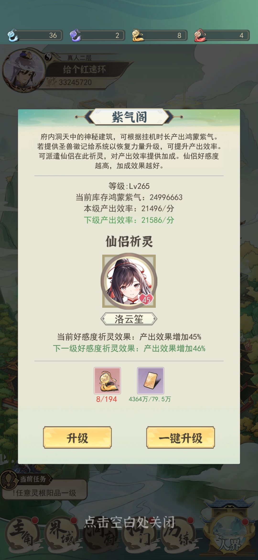 2、仙界开始会卡锻体和灵根,上人开始特别卡灵根。所以尽量提升紫气阁等级和法宝等级,有能力再升一个45级仙友。