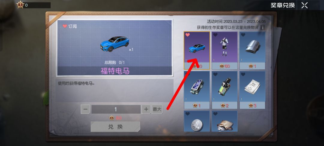 5.以上特训过关即可拿到积分(孤岛求生只要结束无论坚持多久都能给勋章),八十积分可以获得福特野马!