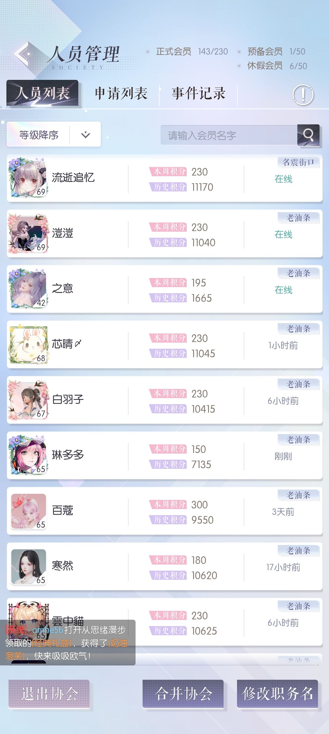 关于协会合并:很多管理都没用过的功能,需要主动联系另一个协会的会长。协会合并分为【主协会】和【副协会】,合并后主协会人员职务积分等不变,副协会所有人以普通成员的身份加入主协会,会员积分和历史积分保留,副协会直接解散。等于主协会一次性收了一百多人。很多人为什么没用过?一是哪个协会做【主协会】问题,协商不好一拍两散。二是联系问题,你必须得认识其他协会的会长,才可以协商,有些建了协会直接当甩手掌柜的,凉了也不管普通成员死活,这种时候只能选择自己跳槽了(加入新协会,历史积分清零,会员积分保留)