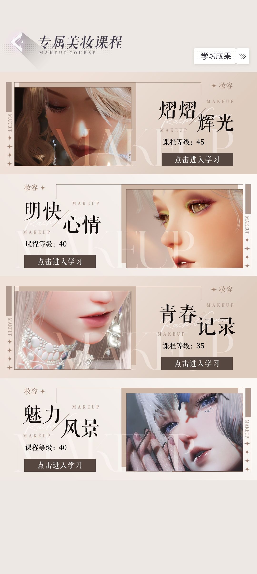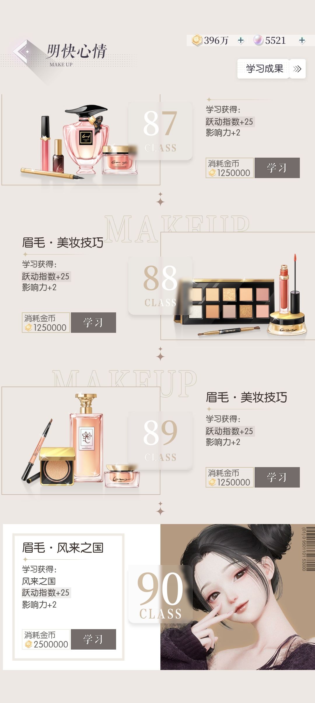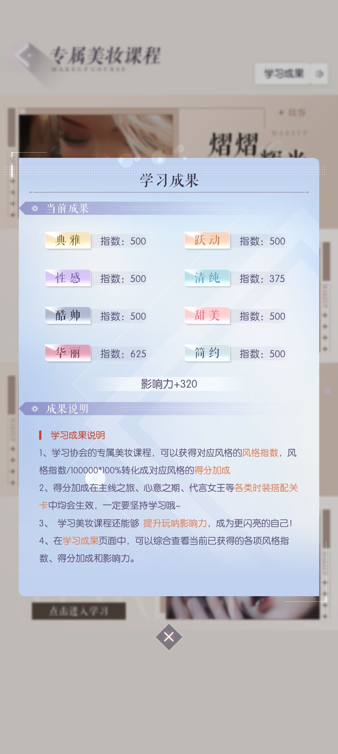 用金币和会员积分可以点属性(很贵),上限和协会美妆等级有关。这里的属性和羁绊卡一样百分比加成(属性/10000×100%)一般玩家等级多少级点到多少级就行了,比如玩家等级40级,所有课程点到40级就行了。要留金币等就点30-50级,金币留着抽【星光秀场】(抽完要1500-2000万金币),用来点属性点不了几级。