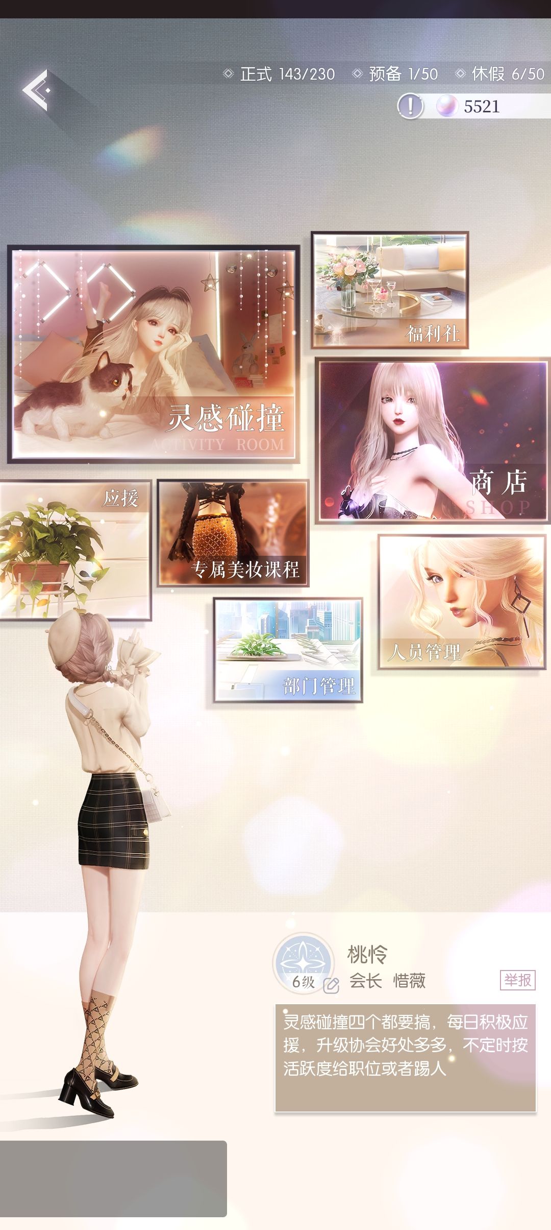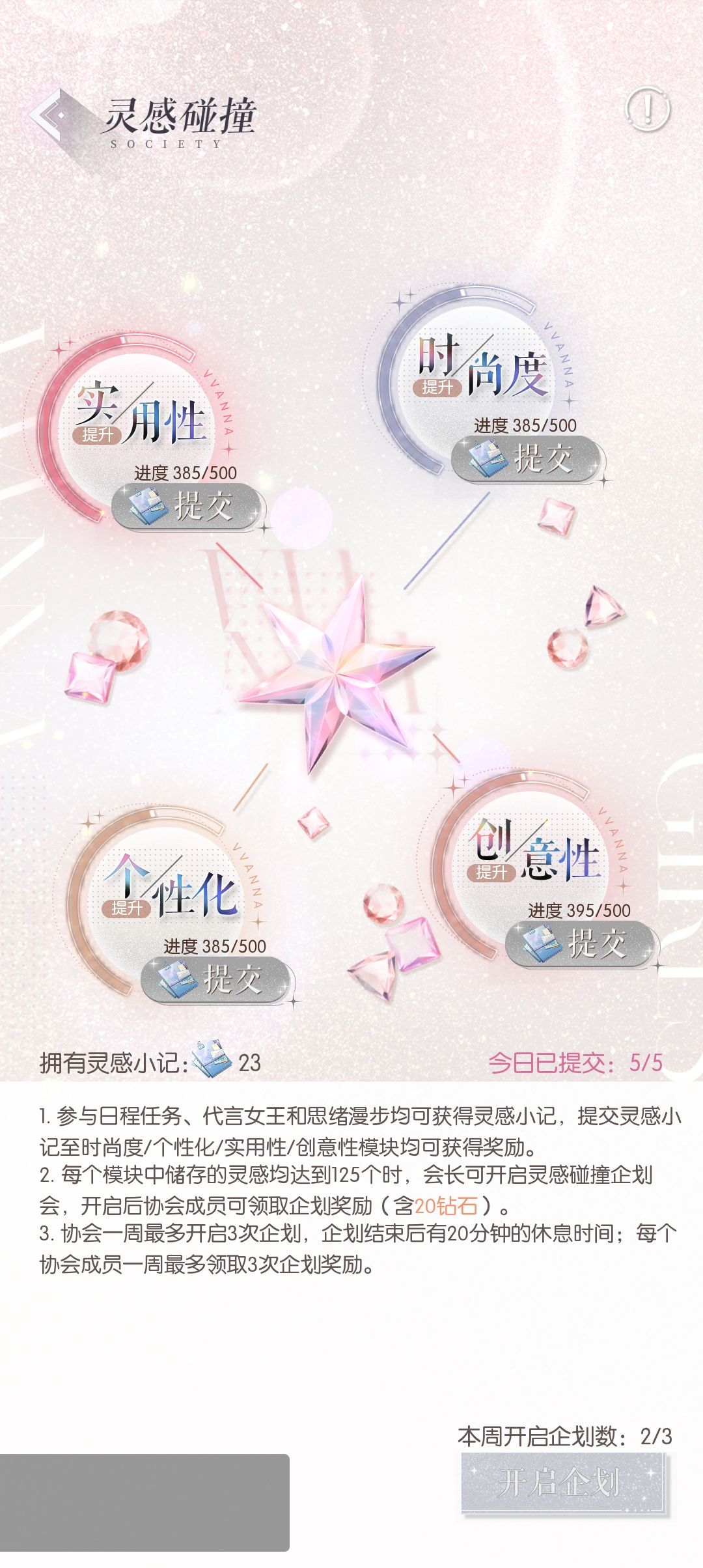 灵感碰撞:点击【灵感碰撞】,提交5次灵感小记。管理可以选择一周的任意三天开灵感,开启后协会所有成员都可以领取奖励。界面1.5版本改了,刚开服不是这样的。如果一个协会每周3次灵感都开不了,需要考虑跳槽了。跳槽优选6级及以上协会,3级及以上协会差距就不大了。