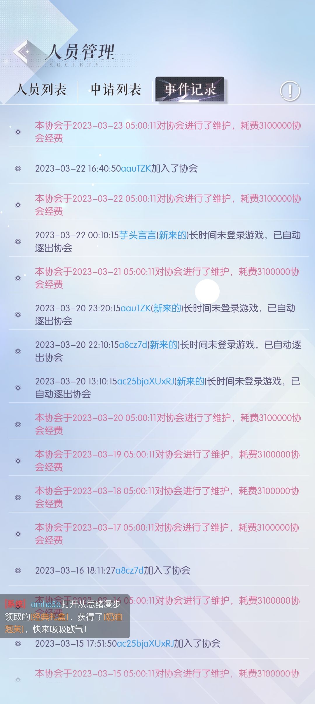 每个区就那么些活跃玩家(萌新都去新区了),所以刚开服要建协会的要快点建(没时间管就别建),建完把人收满就算站稳脚跟了(选个好点的名字也很重要),经常把不活跃的踢掉,在聊天频道收人,后面活跃玩家不到总人数的一半的时候,可以考虑协会合并。