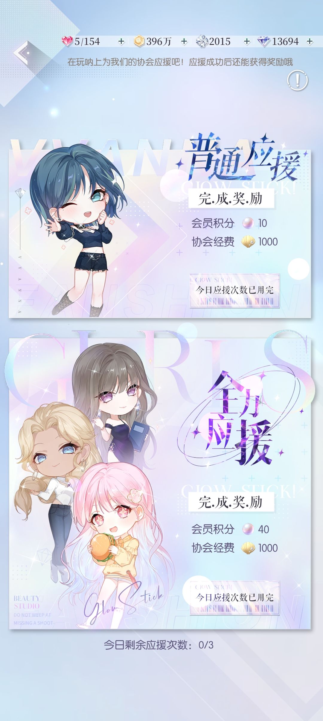 每天必点三次,普通应援就可以了。协会每天维护需要经费,经费不够协会功能无法使用。